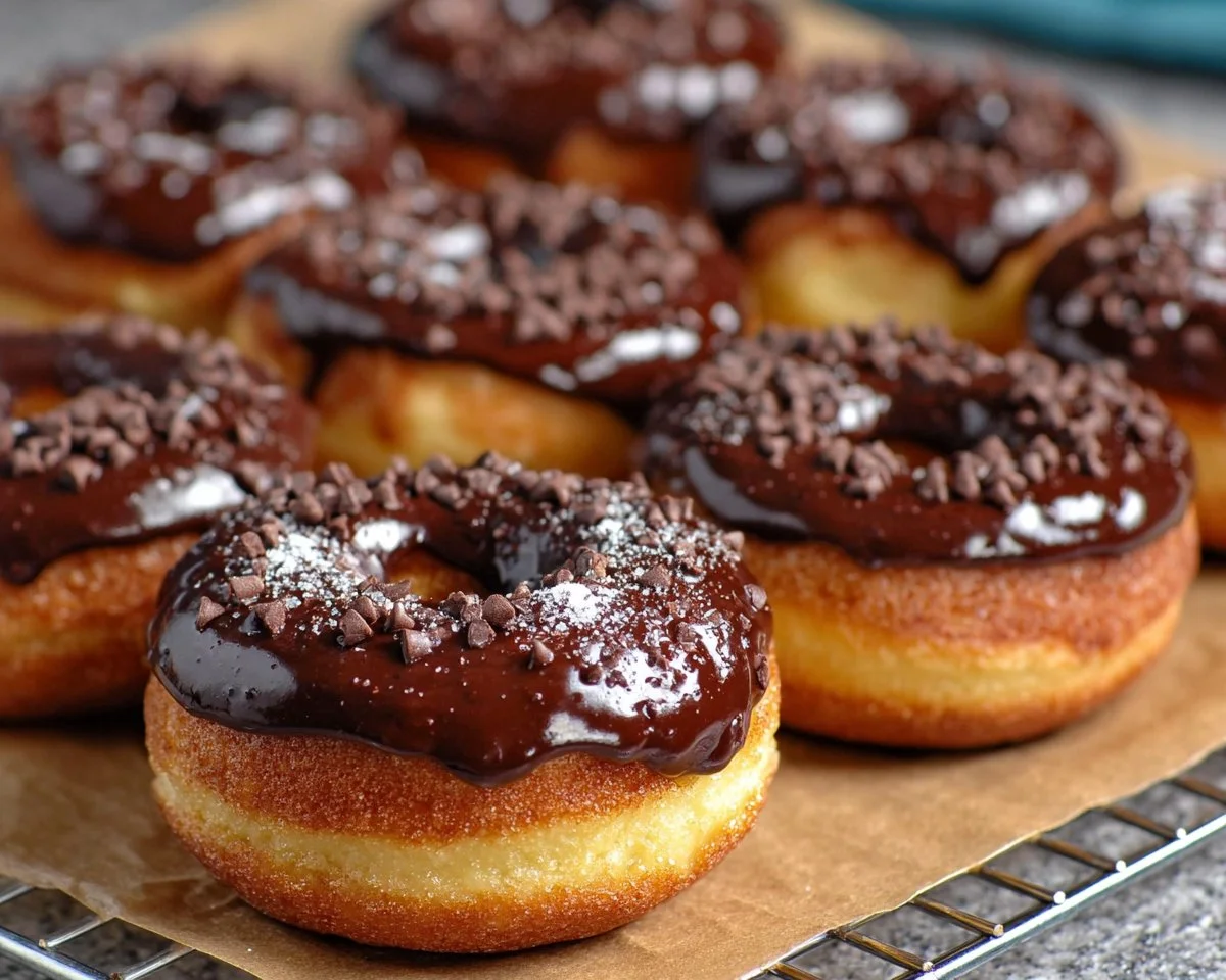 - Prepare the chocolate glaze by melting chocolate chips with a splash of cream or butter until smooth. Dip the tops of each donut in the glaze, letting excess drip off, then place back on the rack to let the glaze set before serving.