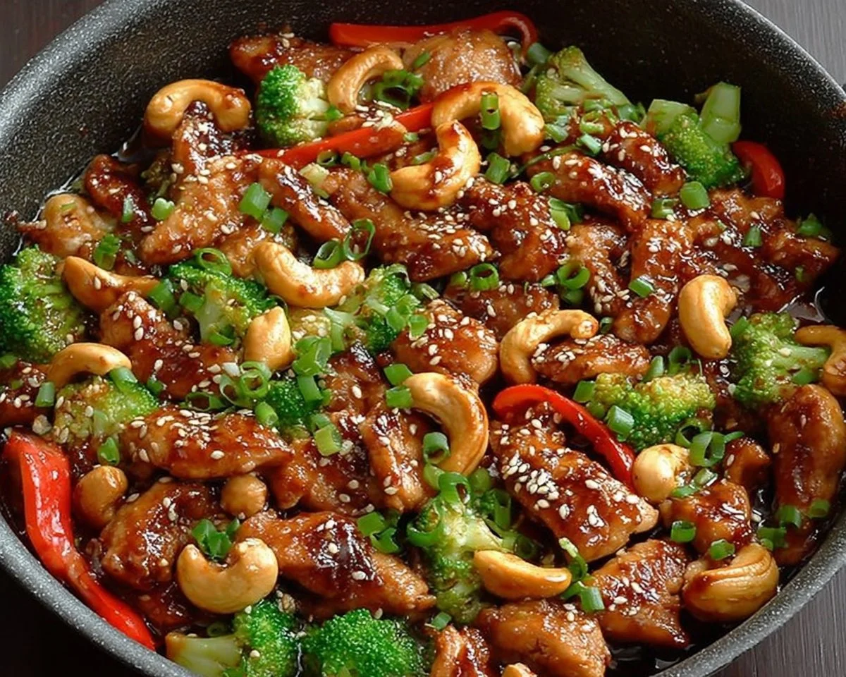 Creamy, juicy, and bursting with savory-sweet flavors, this Cashew Chicken Stir-Fry is a fast, family-friendly meal that combines tender chicken, crunchy cashews, bright red bell pepper, and crisp broccoli in a glossy soy-hoisin sauce.