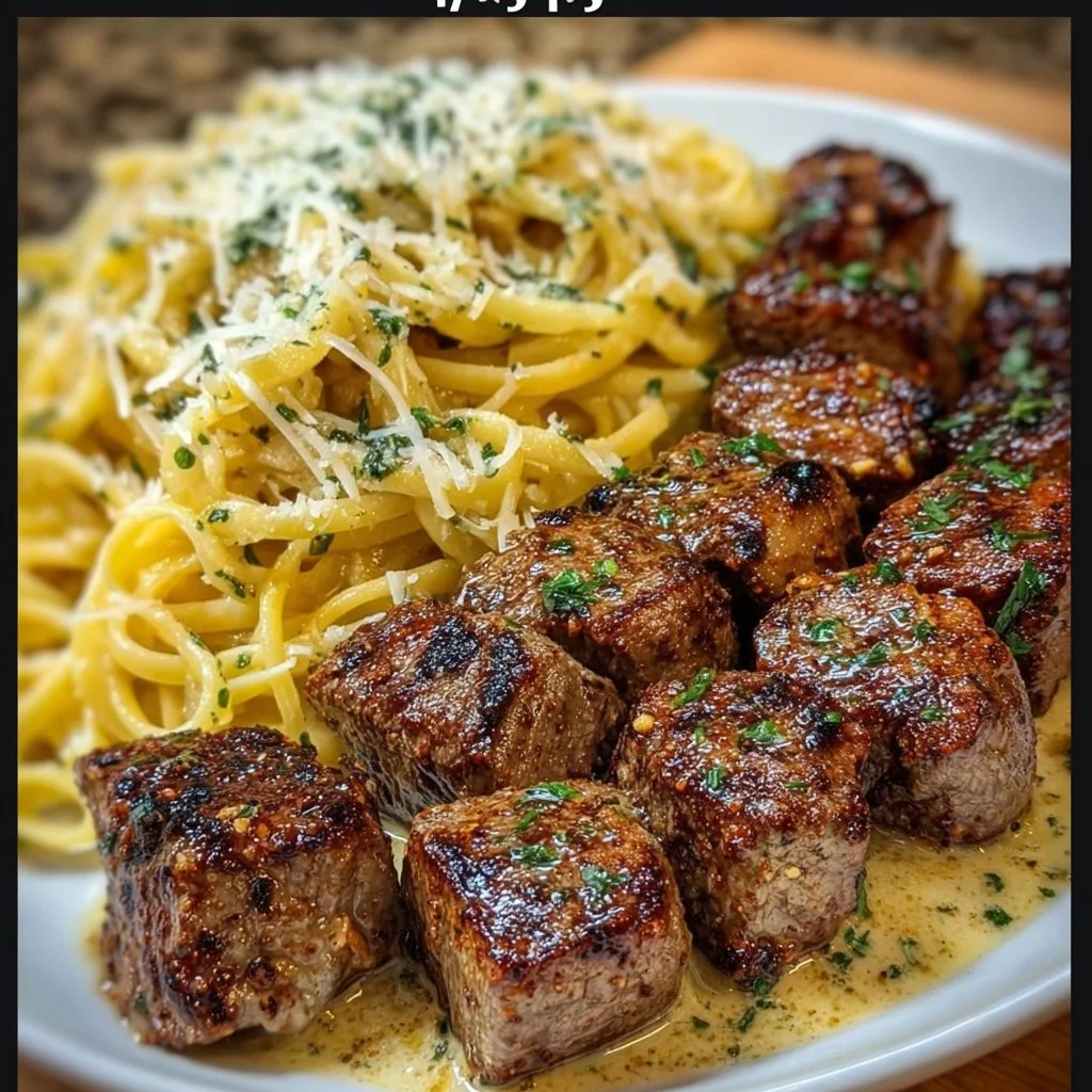 Cheesy Garlic Steak Bites & Creamy Linguine