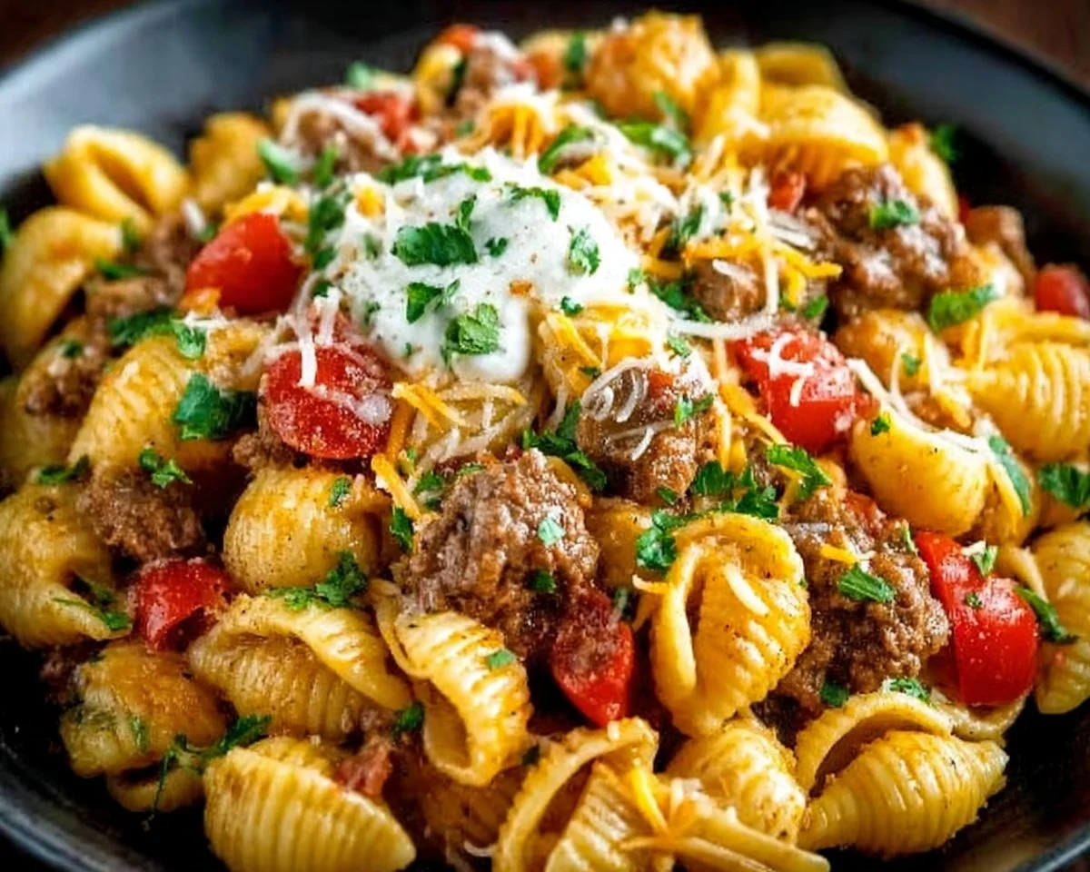 What happens when taco night crashes into pasta night? You get Cheesy Taco Pasta — a fun, slightly cheeky name for a dish that combines taco-seasoned ground beef and melty cheddar with hearty pasta shells. Why call it that? Well, don’t ask me — ask the person who decided tacos and noodles should meet at dinner! Isn’t it funny how comfort food sometimes comes from happy accidents? Some might say “the way to a man’s heart is through his stomach,” but this recipe wins hearts for everyone at the table. Try it and see why the name sticks — then pass the tortilla chips.