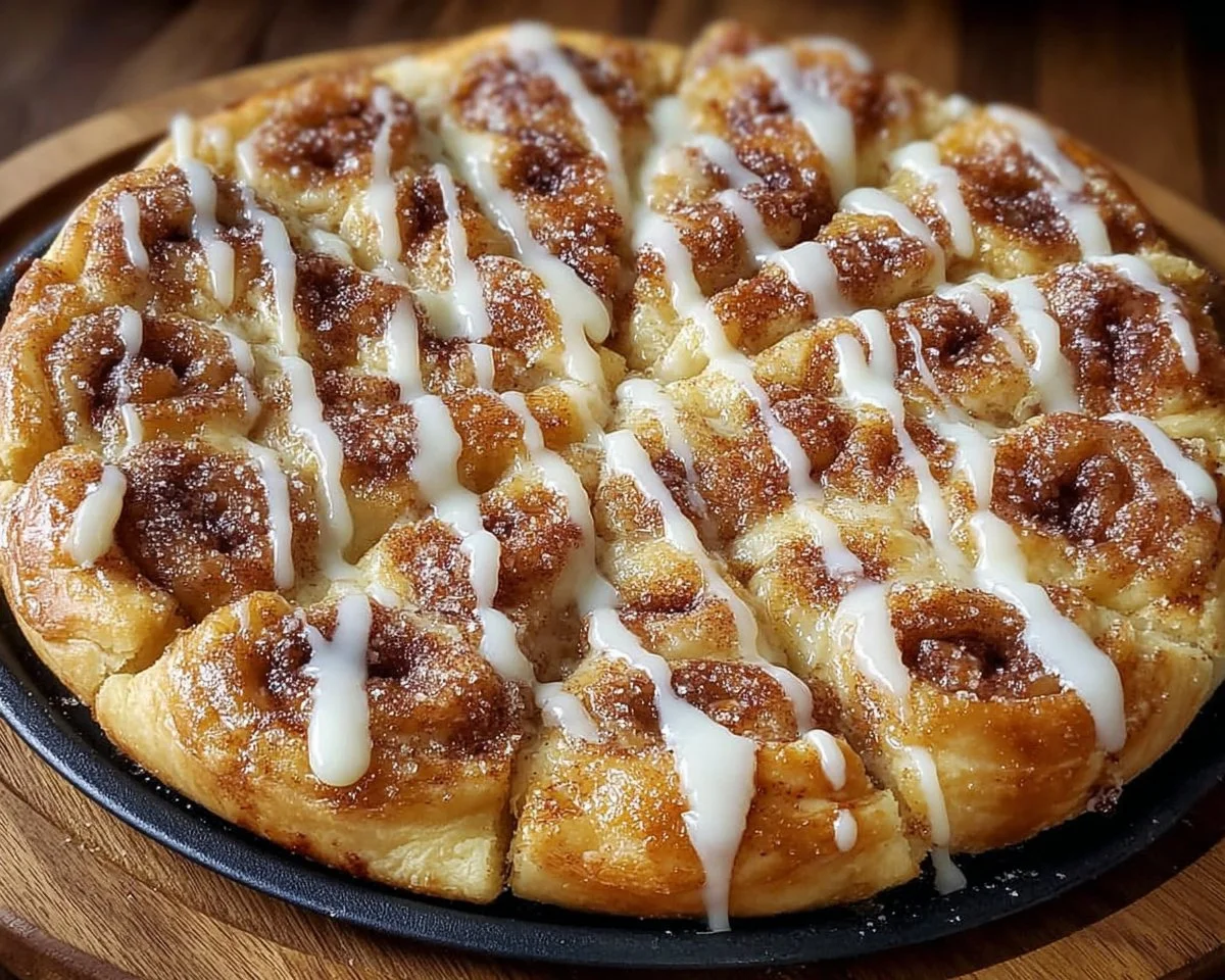 What exactly is this whimsical-sounding dish? Imagine a pizza, but instead of savory sauce and cheese, you have melted butter, a generous dusting of cinnamon and sugar, and a sweet drizzle of vanilla icing — all baked on a sheet of buttery crescent roll dough. Why call it a pizza? Because it’s shareable, sliceable, and made on a crust — so why not have a little fun with language?