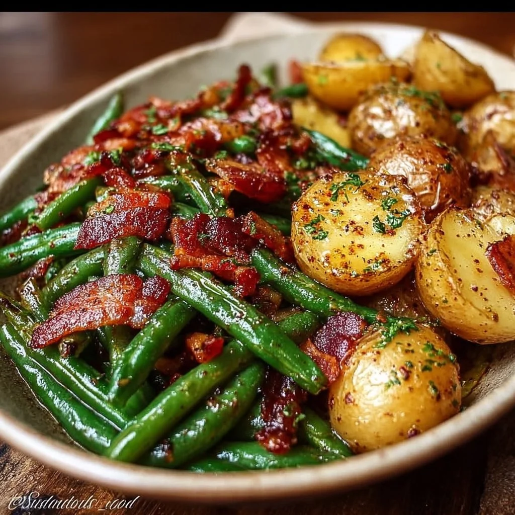 Creamy, savory, and comfort-food worthy, this dish combines crisp-tender green beans, golden roasted baby potatoes, and salty bacon for a satisfying meal.