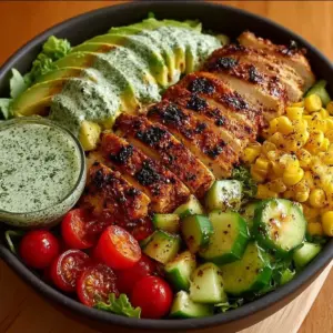 - Assemble the Bowl: In a large bowl, place the chopped romaine or greens at the base. Layer on the diced avocado, chopped cherry tomatoes, sliced cucumber, and grilled corn.