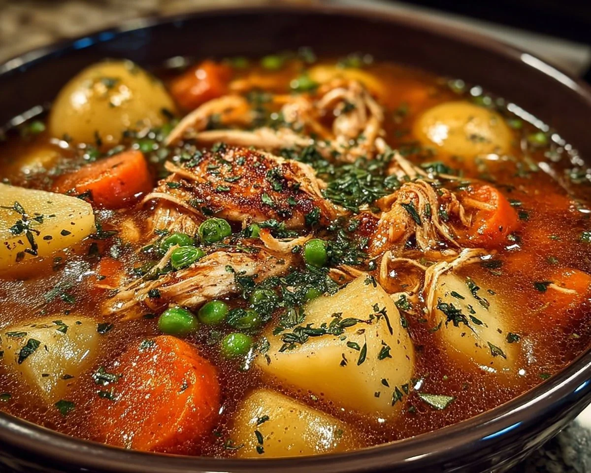 - Stir in the shredded chicken and 1 cup frozen peas. Simmer for another 5–10 minutes until the chicken is heated through and the peas are tender. Ladle the stew into bowls and garnish with fresh thyme or parsley. Serve hot with crusty bread or your favorite sides.