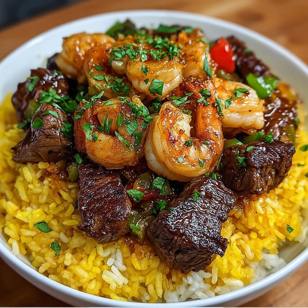 Creamy, juicy, and packed with sweet-savory flavor, this dish combines tender steak bites and plump shrimp in a sticky honey-garlic glaze over fragrant turmeric-yellow rice.