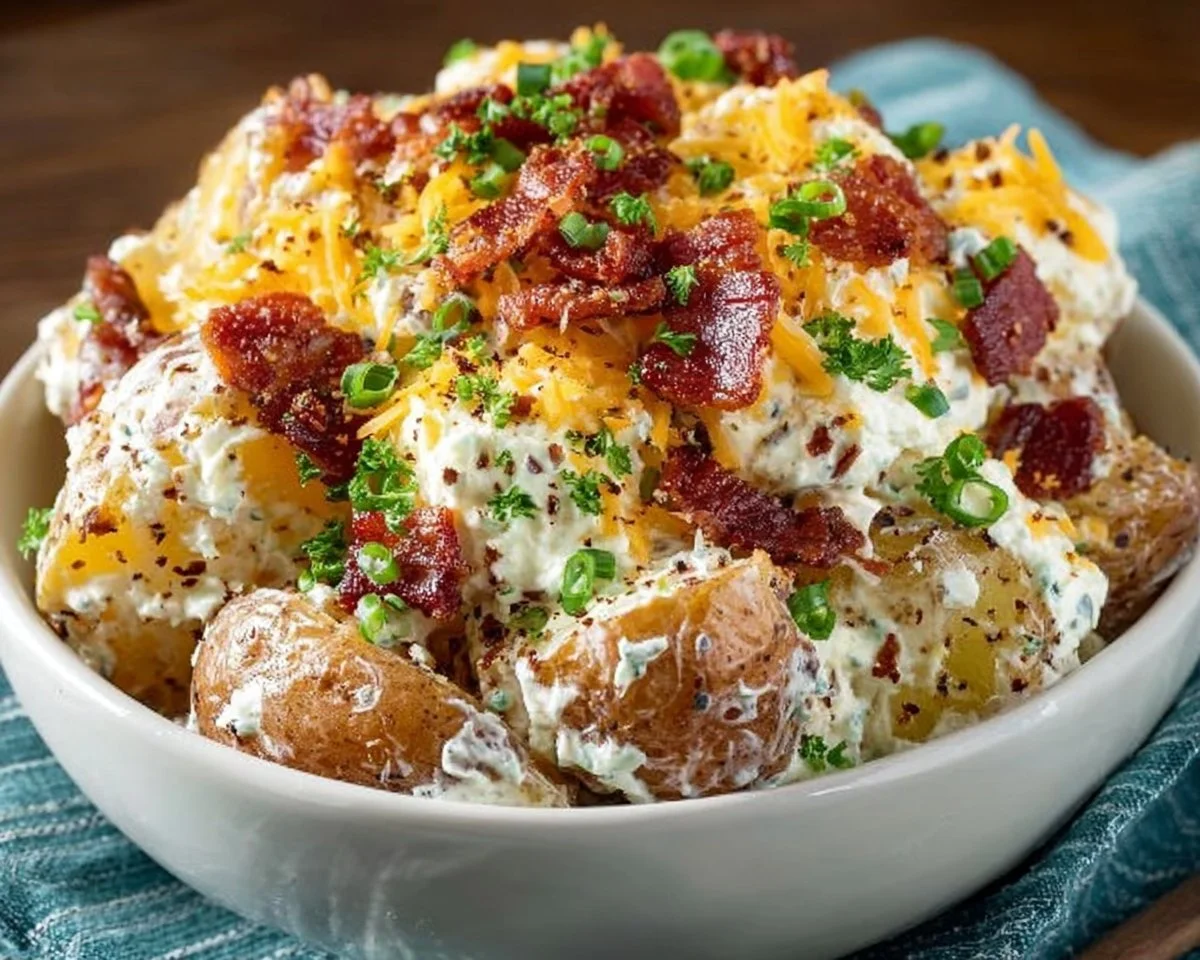 What’s in a name? Loaded Baked Potato Salad sounds like someone took a classic baked potato, gave it a little party dress, and invited a dozen friends. Why call it “loaded”? Because it’s piled high with all the goodies — bacon, cheese, and green onions — that make a baked potato irresistible. Who came up with the idea? Maybe a hungry host who remembered that the way to a man’s heart is through his stomach. Or maybe it was a picnic rebel who thought potato salad deserved a cheesier life.