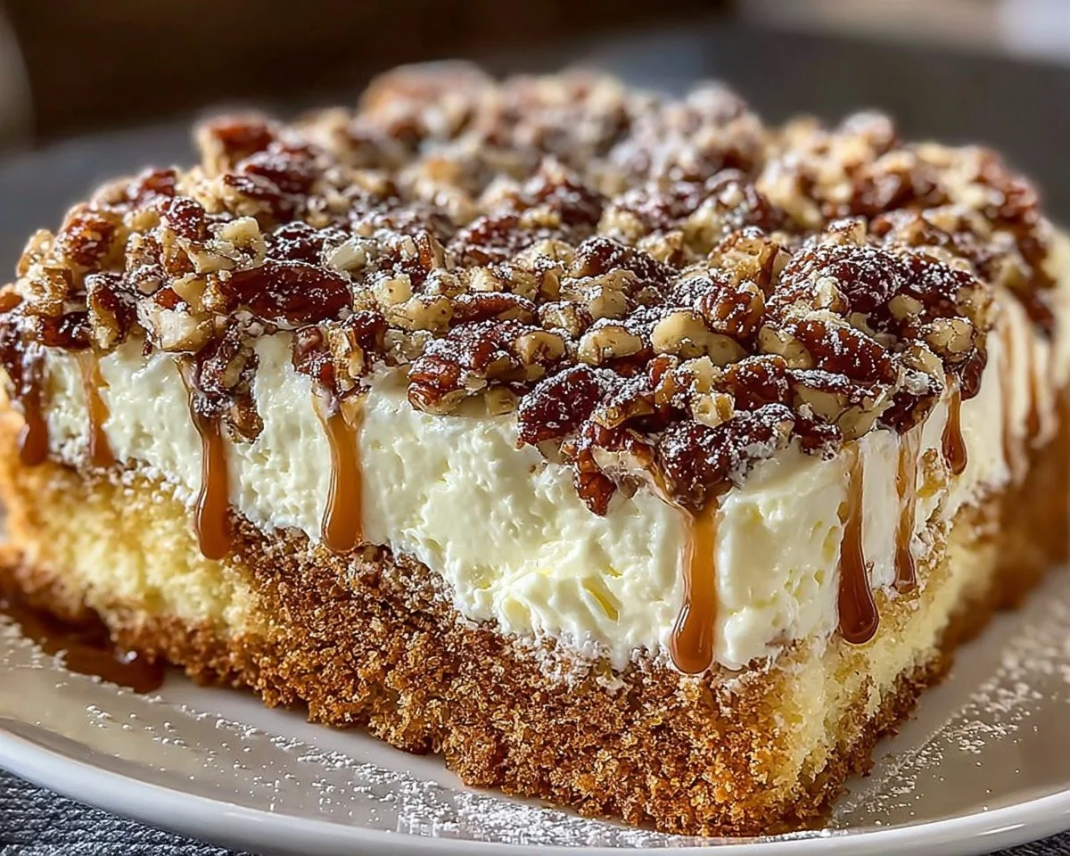 This recipe is straightforward and forgiving, which makes it perfect for beginners and busy cooks. You’ll combine a boxed cake mix with butter and eggs for the cake layers, fold in chopped nuts for texture, and sandwich a smooth cream cheese-sugar mixture in the middle. Prep time is under 15 minutes, bake time about 30–40 minutes, and total time under an hour.