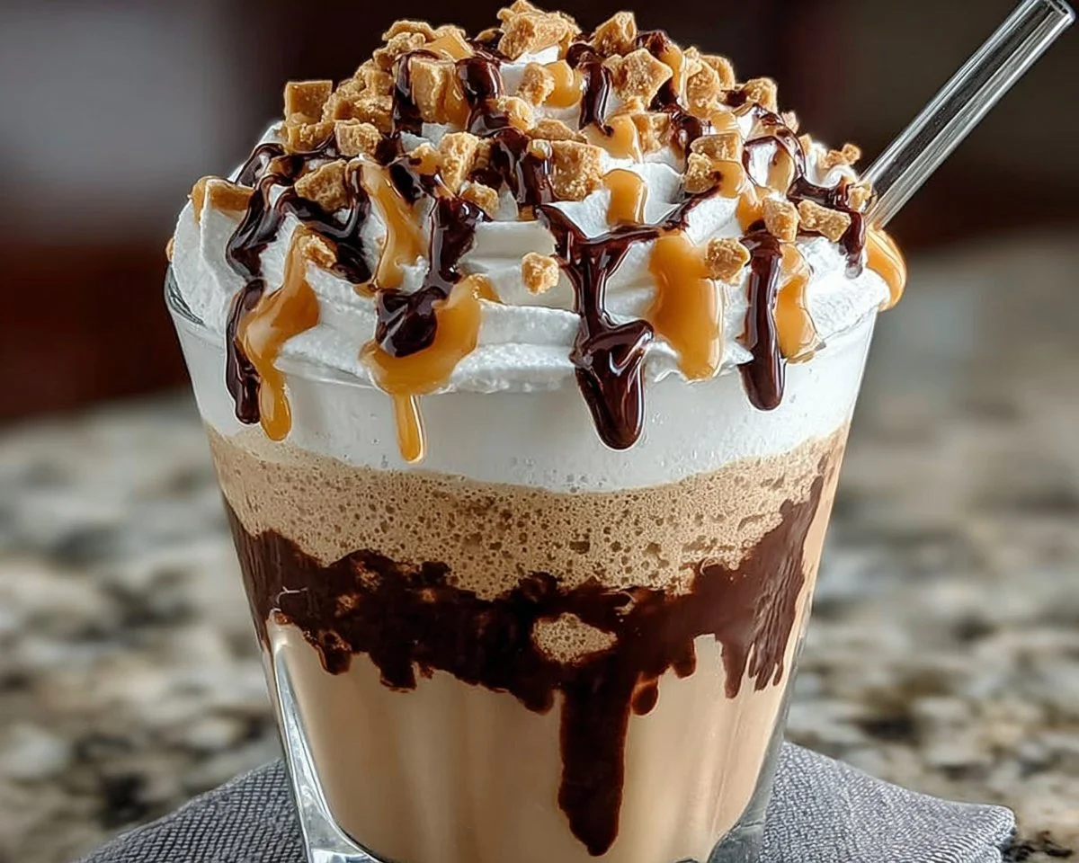 - Serve: Pour the frappuccino into glasses. Top generously with whipped cream, then drizzle chocolate syrup and a thin stream of melted peanut butter over the top.