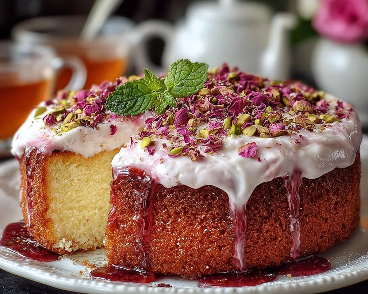 This cake pairs beautifully with light, refreshing sides and beverages. Try a citrusy salad of orange segments and mint to contrast the rose sweetness, or a simple bowl of fresh berries for acidity. For drinks, pair with chilled green tea, light chai, or a sparkling water with lemon. If serving as part of a dessert spread, include small bites like almond biscotti or shortbread to add crunch.