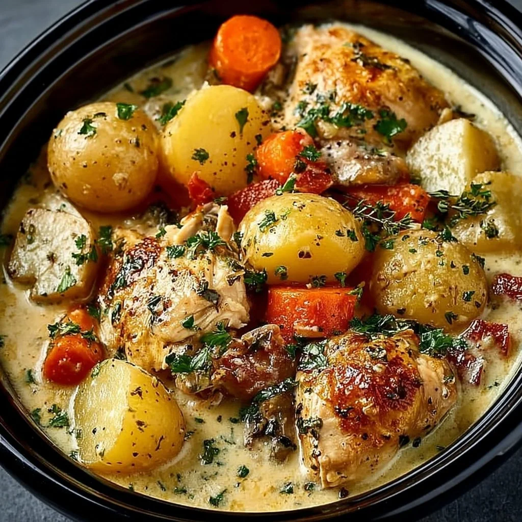 This recipe is wonderfully simple: layer the chicken and veggies in the slow cooker, whisk together a creamy garlic sauce, pour it over, and let slow heat do the work. The standout element is the creamy, garlicky sauce that reduces and mellows as it cooks into a luscious finish. Prep takes about 15 minutes and cooking is 6 to 7 hours on LOW or 3 to 4 hours on HIGH. Expect tender chicken, soft potatoes, and carrots in a savory sauce that’s spoonable over rice or served right from the slow cooker.