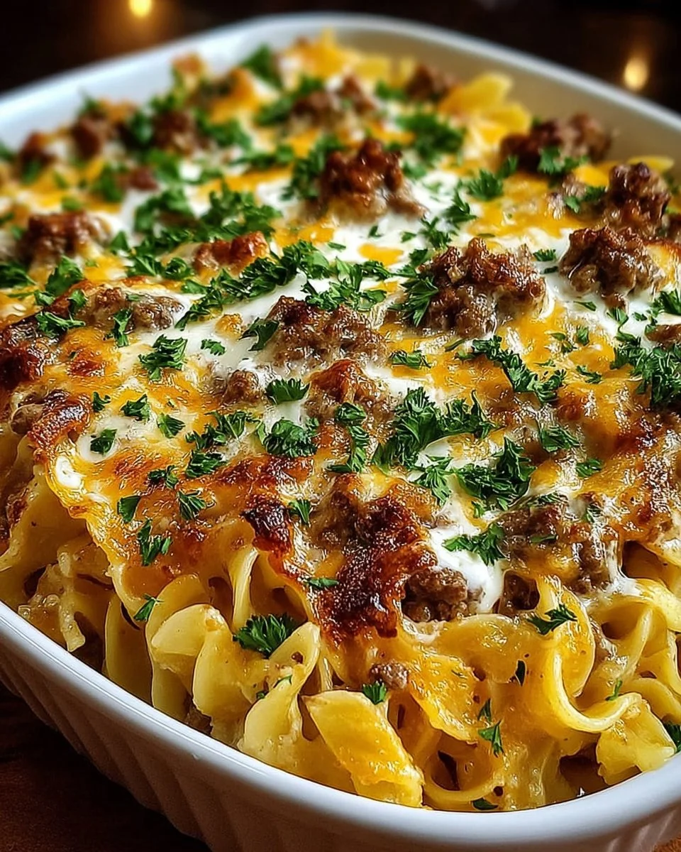 First, the star of the show is the creamy, tangy sauce that clings to every noodle and piece of beef — it’s pure comfort in every forkful. Second, making this at home is budget-friendly: basic pantry staples stretch to feed a family without expensive ingredients. Third, the toppings — bubbling cheddar and a sprinkle of fresh parsley — add texture and a bright finish that lifts the whole dish. If you like other beef-and-noodle comfort dishes, you’ll also enjoy the quicker skillet-style version over on the blog; it’s a faster, stovetop sibling that’s great for nights when you need dinner even faster: 15-minute beefy noodle skillet. Ready to make something cozy and uncomplicated? Let’s get cooking.