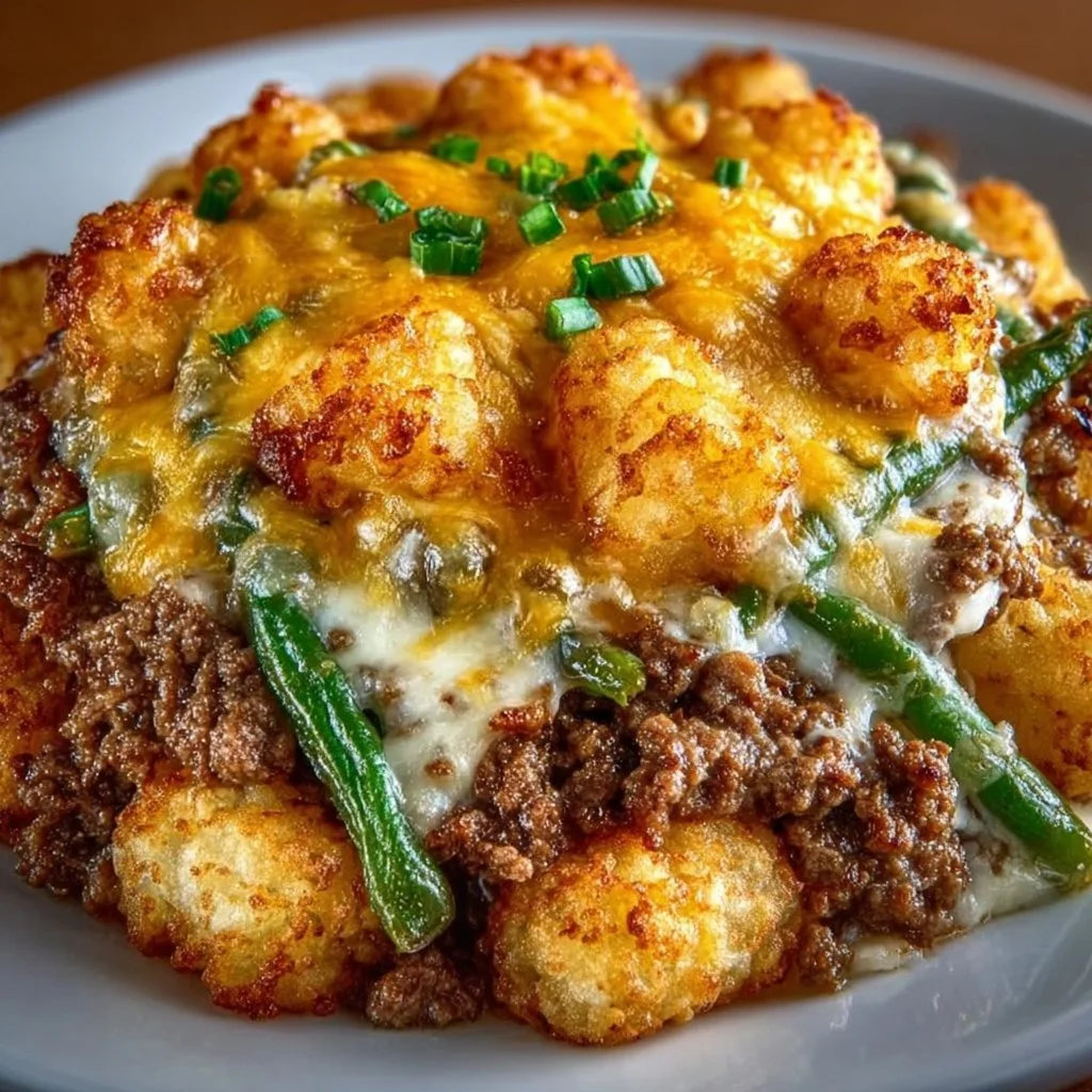 - Lightly grease a 9×13-inch baking dish. Arrange a single layer of frozen Tater Tots across the bottom. Spread half of the beef and green bean mixture over the Tater Tots, then sprinkle with half of the shredded cheddar cheese. Add another layer of Tater Tots, then top with the remaining beef mixture and the rest of the cheese. Press lightly so the layers sit evenly.