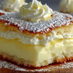 Delicious squares of fluffy cake filled with creamy vanilla custard, topped with whipped cream.